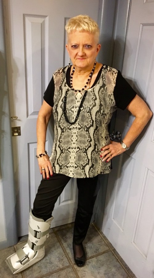 Welcome to another day in Carol's Corner. Still working on acclimating to this injury. It is not easy but I have to take one day at a time. Yesterday I didn't leave my bedroom except for bathroom breaks and I didn't get dressed. Everything I do takes so much effort and leaves me drained. Today I had to get out of the house for just a bit, so with a lot of effort I got myself dressed, makeup and hair done, and with hubby's help managed to get out of the house and go out for dinner. Today I seem to be having more pain. Hope tomorrow's better. So the winning name for this ensemble comes from Jo Ellen Jatczak with,” Handle With Care.”