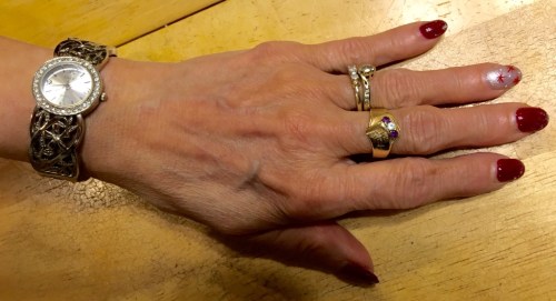 Wore a combination of jewelry I made and one necklace I didn't. Decided to layer 2 different necklaces and wear 2 bracelets together for a different effect. This ring seemed like the perfect fit for this ensemble.