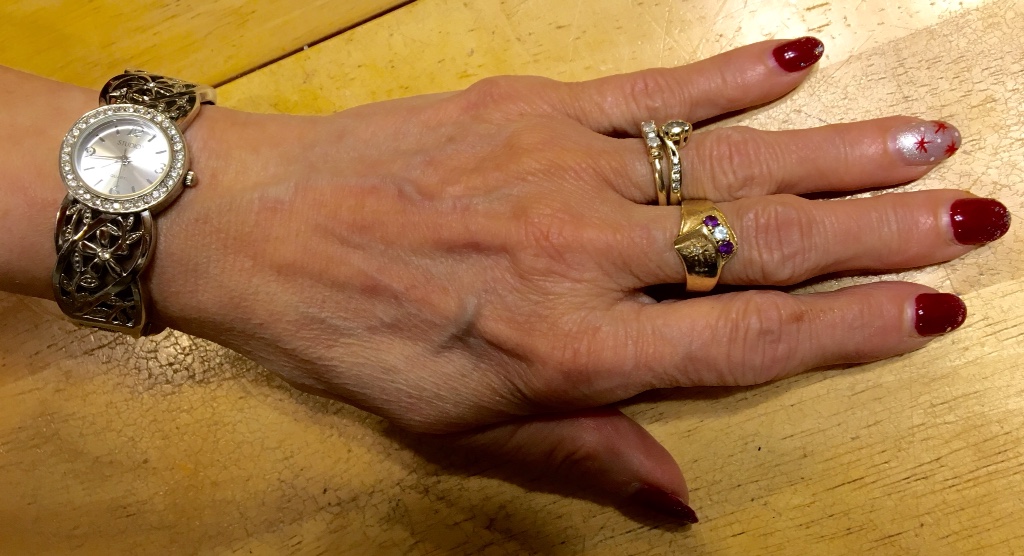 As always I have a watch that looks like a piece of jewelry. And of course for at least the next 8 weeks my newest fashion accessory has to be this lovely boot, but I'll manage to rock it anyway.