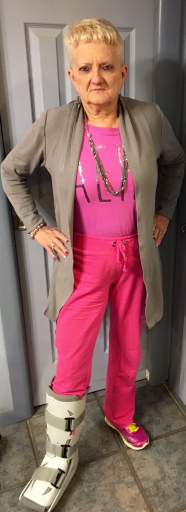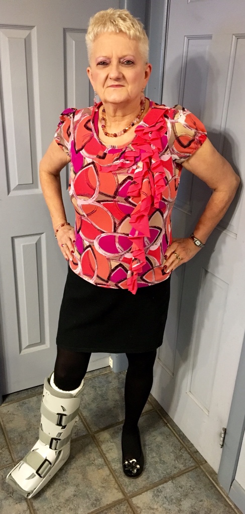 Hello out there in cyber land. Welcome back to Carol's Corner. Sorry for the extended absence yet again. As you can see from the picture above I have had another stroke of bad luck. Three or four days ago, forgot what day it was, I was taking Christmas decorations back down to the cellar. I slipped on the bottom step, slammed my foot against concrete and twisted my foot every which way. The end result is that I fractured my ankle by the ankle bone and my foot on the bottom right hand side just above where the toes start. I knew I had to have done something because the pain was excruciating and I couldn't put any weight on it. I am lucky though in two ways. It doesn't require surgery thank God, and I can have this boot instead of a cast. The bad news is that I will be laid up for about 8 weeks. That part sucks. I decided today that even though I have to wear this boot and not be able to do much I'm still gonna rock my look , so here's my pic today rocking it in spite of it all. Like I told my groups,” This fashion diva might be down, but she sure ain't out; rocking the look!!!”