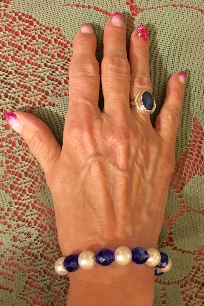Chose this Royal Blue and Pearl tone jewelry set I made to complement this and of course my awesome Lapis and Sterling ring that is one of six I had custom made by a jewelry artisan I know.