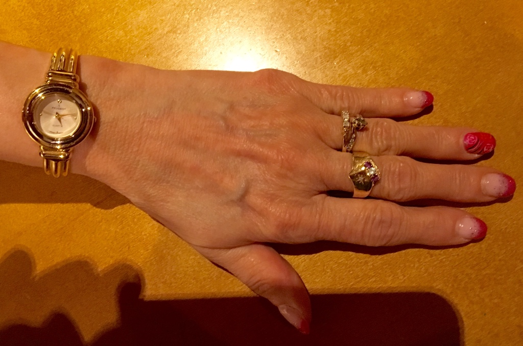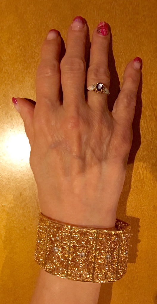 I wore different jewelry than I've worn with this before. The necklace and earring set was a deep purple with gold edging of the stones and good chain so I opted for other goldtone accessories. This beautiful bracelet was a beautiful compliment to the purple accessories. It is actually meant to house my FitBit tracker, but can be used as a bracelet. Since my FitBit had to be put on an 'extended leave of absence' I decided I might as well use it anyway. It is a gorgeous piece. My ring is real gold with Amythyst and Opal.