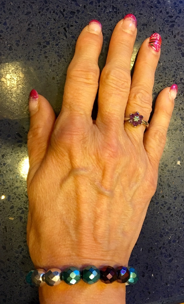 My jewelry was another 3 piece set I made and the color's complemented my blouse perfectly as did my floral Amythyst and Blue Topaz ring.