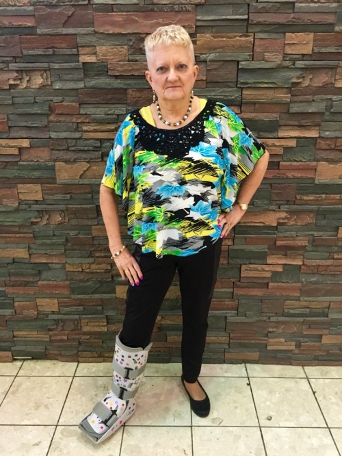 Welcome to a new day in Carol's Corner. Pull up a chair and stay awhile. As I am not posting as much since I've been laid up, I would like to suggest something to my readers and especially any newer readers that have visited here. On days that I don't have a new issue of Carol's Corner, I invite you to go to the archive section in the top right of the page and then go all the way back to the beginning and start reading some of my previous issues a few every day. There's lots of beneficial material to be had. So now, back to the present. Today's picture was taken at the mall in Ithaca when I went to see a movie. Thought the stone background made a great backdrop for this fun ensemble. Diane Panda Sabbath was the winner naming this,” Earth Meets Sky.” Thought that was a perfect description of my fun top.