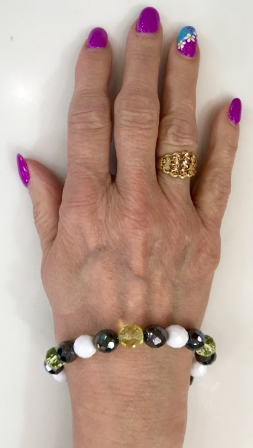 The three piece jewelry set I chose was one I made and it picks up some color's in the blouse. My ring is a 24 carat ring my husband got me in Turkey on one of his layovers overseas. Can't remember which trip but he was either coming or going from either, Kuwait, Afghanistan or Iraq.