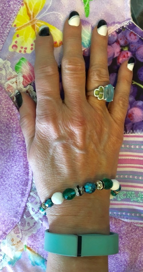 With this jewelry set I made some time ago, I was able to pick up all the subtle color hues that this top encompasses. And the FitBit Band ties in quite nicely. Also I love this ring which is Blue Topaz and Peridot set in Sterling Silver. The right accessories can turn any outfit into something special. Play around and have fun. You just don't know what a difference all these little touches make in how you feel about yourself, and also in how others see you and it sometimes makes for great conversation. I've had awesome conversations with total strangers who stopped to tell me they liked something.