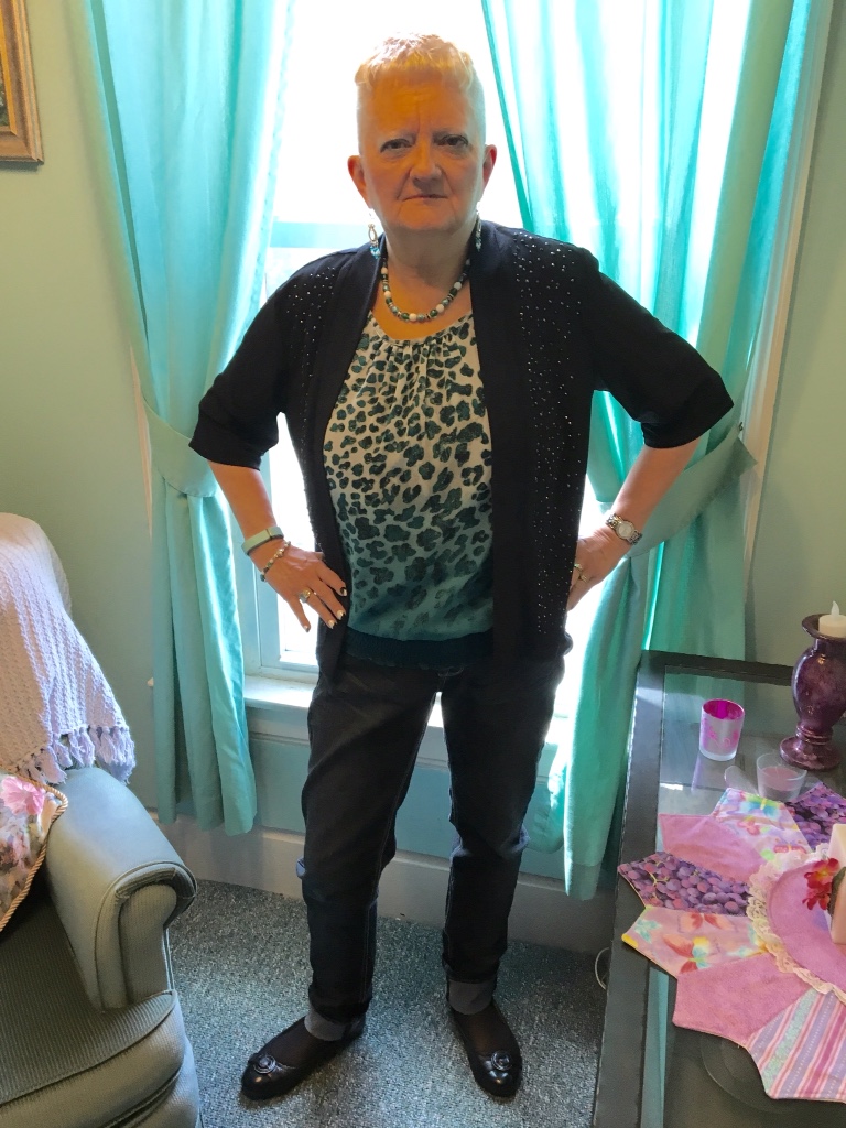 My picture today is another of my casual looks, yet at the same time kind of sophisticated. Just by adding this jeweled topper and some nice jewelry, you kick it up a notch. I call this Casual Sophistication and Catherine Warner wins the naming game with, “Sassy Lady”.