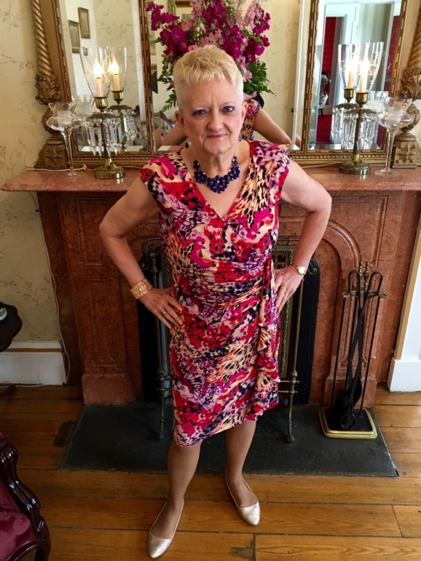 I chose the statement necklace and matching earrings which were a deep shade of purple edged in gold. It picked up one of the colors that was present in the dress. And then I opted for this beautiful gold filigree and rhinestone bracelet that actually houses my exercise tracker. My ring is one hubby bought me many moons ago and is a deep Amythyst with Opals on each side, set in real gold. It's always been a favorite of mine and seemed the perfect choice for this ensemble.