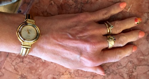 This goldtone watch my mom gave me is my go to watch when I need something gold and it fits my wrist so well. My newest manicure was perfection with this dress My amazing nail tech said this was a new color and I was the first person she used it on. Loved putting this whole look together.