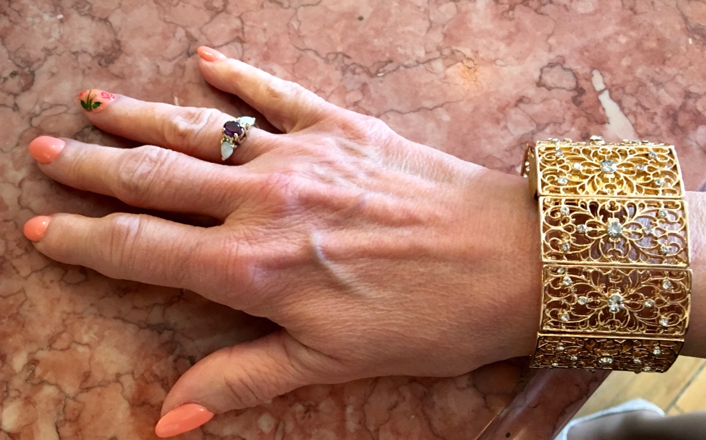 I chose the statement necklace and matching earrings which were a deep shade of purple edged in gold. It picked up one of the colors that was present in the dress. And then I opted for this beautiful gold filigree and rhinestone bracelet that actually houses my exercise tracker. My ring is one hubby bought me many moons ago and is a deep Amythyst with Opals on each side, set in real gold. It's always been a favorite of mine and seemed the perfect choice for this ensemble.