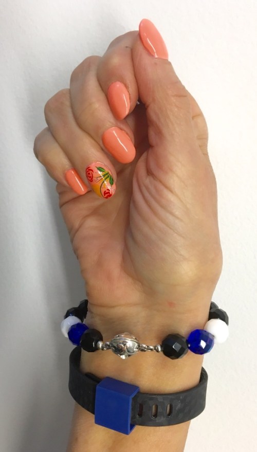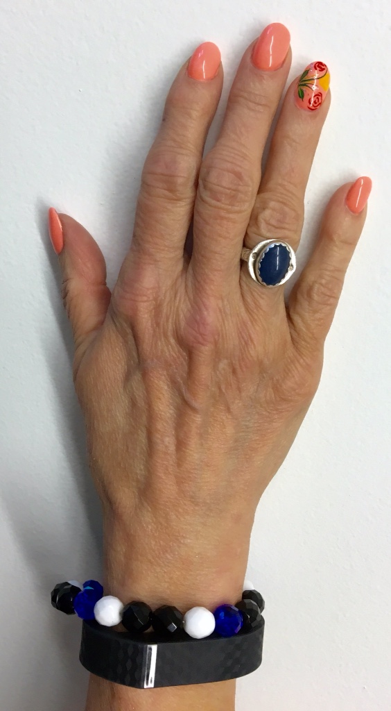 I used a muted checkered black FitBit Band with a Royal Blue clasp cover.
