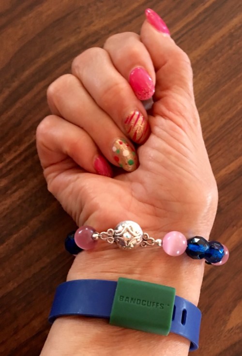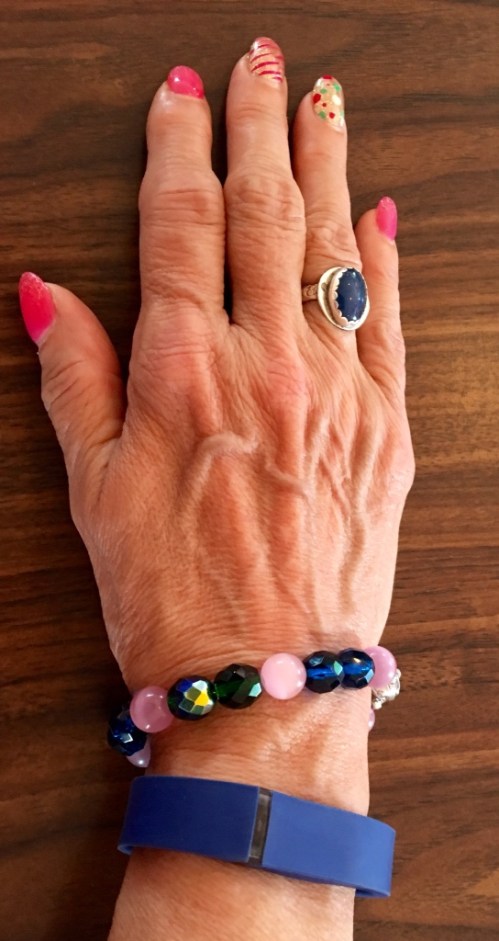The bracelet is part of the three piece set I made to go with this dress. You can't tell from this picture, but there are actually three color's in it, the pink color and a dark blue and a dark green. My Blue Lapis ring was perfect and I liked the color of this Fitbit band with the dress.