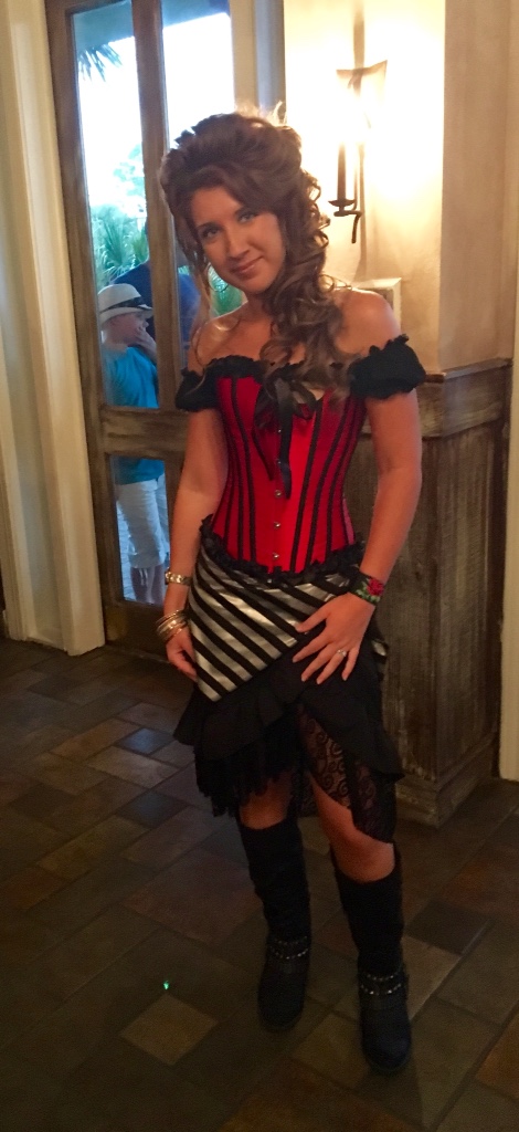 One of the first fun things we did was the night after we arrived, which was a Sunday night. I had booked two of the three shows before we left. This was the first one. It was called “Pirates Voyage “. It was a Dinner Show that included a four course meal during the course of the evening. When we arrived it had started to rain. As I was making my way from the car to the building a lovely girl in period costume met me with an umbrella and held it over me till we got to the building. That was a surprise. Then another pretty girl greeted us as we entered . I asked her if I could take her picture. This is her.