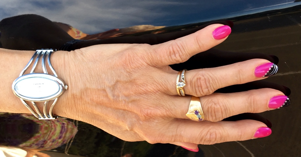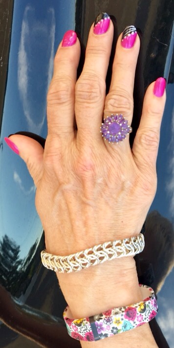 I always love it when I get to wear this beautiful FitBit Band. This beautiful sterling bracelet pairs nicely with my necklace and earrings and my Amythyst cocktail ring is always a good choice when any shade of purple is in play. My newest manicure is beyond gorgeous. I have a nail tech that rocks.