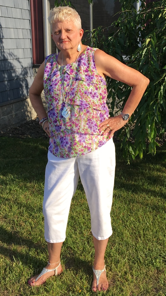 Welcome back to Carol's Corner. Sorry it's been so long since I published a new issue. At the moment I'm recovering from a recent eye surgery; hence the reason my eye doesn't look so great. I get it checked again this Friday and hopefully things are as they should be. So let's get this show on the road. Wanted to wear something that had a real happy feel to it and this blouse is just the thing. Love the color's, love the print, love the style. It pair's quite nicely with these white denim capri's and these awesome new sandals. I like the silver jewelry with it. This necklace and earring set is a favorite of mine when I have a higher neckline. Don't have a caption winner to announce on this one because I just posted the picture today.