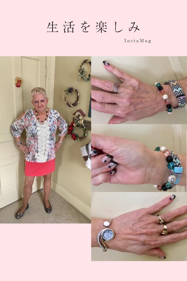 Welcome to another edition of Carol’s Corner. Disclosure: I was  90% done and somehow lost everything. Pray that is not the case this time. So let’s start with today’s pictures and move on to the real topic of tonight’s post which you can glean from the title above. Love everything about this ensemble. Bought this top recently, along with another one like it in a different color and pattern . Got them at Walmart for only $12.86 a piece. They are a really soft knit. I love the style and especially love the sleeves. So most of you know I am all about the accessories. The best part was I had all of them on hand already. The jewelry I wore with this was some I had made before, but complement the outfit quite nicely. My gunmetal flats bring out the gray tones in the top. I chose my many colored zig zag striped Fitbit band and a combination of complementary clasp covers . And my watch has just that touch of bling. I have dubbed this ensemble, ” Feeling Just Peachy”.