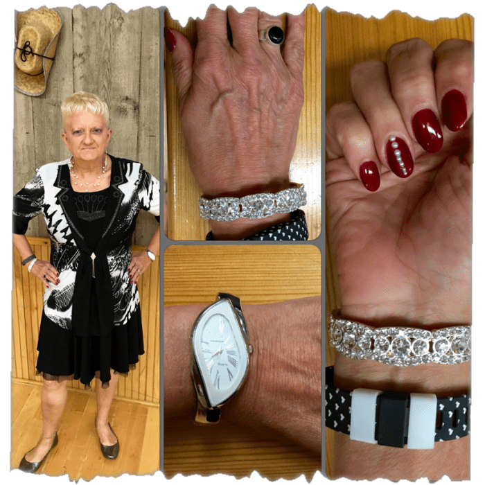 So let’s start with the fashion portion like always. Just recently, I started experimenting with some cool photo apps, and this is my debut here on Carol’s Corner, of one of my efforts. It’s really a lot of fun trying to see what I can come up with. What’s neat is that I can put all of the different elements in one picture. This was the ensemble I wore dancing Saturday. Everywhere I went wearing this , I got rave reviews from everyone. I got complements everywhere. This ensemble was definitely all about the bling. Kim Bernard aptly dubbed it,” The Rhinestone Cowgirl”. The blouse has bling all over it. And I thought it went really well with my go to circle skirt with the net tier on the bottom. I wear this skirt frequently. In fact I wore it with something else today. It is so versatile. My necklace, bracelet and earrings definitely went with the Rhinstone Cowgirl theme that my ensemble suggested. And my FitBit Band, clasp covers, and watch, all tie in with the Black and White of the ensemble, along with my Black Onyx ring. Even my new manicure is replete with it’s own bling in the form of little white pearls. How much fun is that? So let’s get started with what I’d like to talk about tonight.